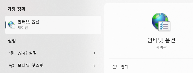 윈도우 왼쪽 하단 검색바에서 인터넷 옵션 제어판을 실행 시킵니다.