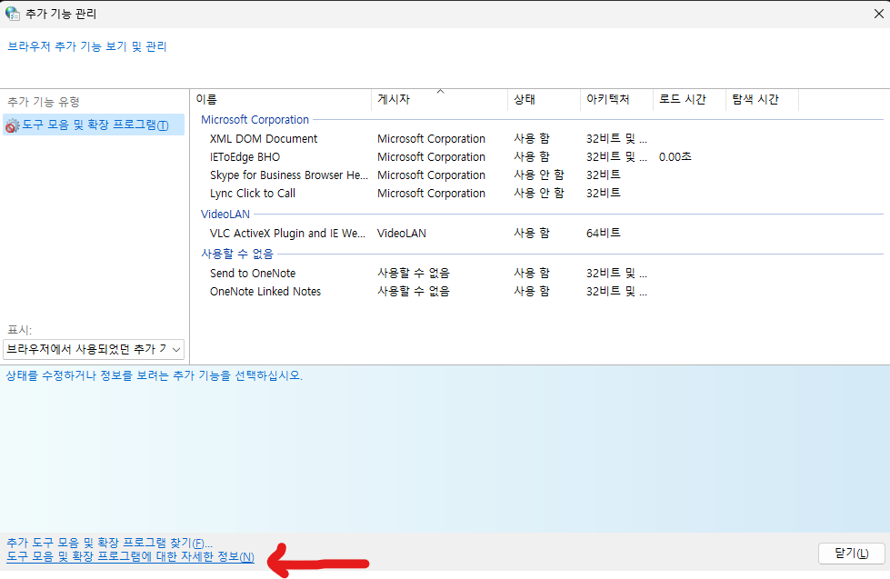 2. 추가기능관리 버튼 클릭 후 하단의 '도구 모음 및 확장 프로그램에 대한 자세한 정보' 링크 클릭