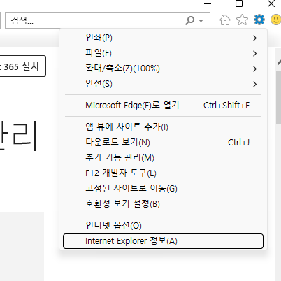옵션을 열어서 Internet Explorer 정보를 확인해 봅니다.