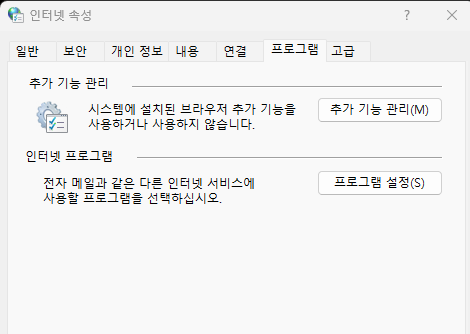 인터넷 속성 -> 프로그램 탭 선택