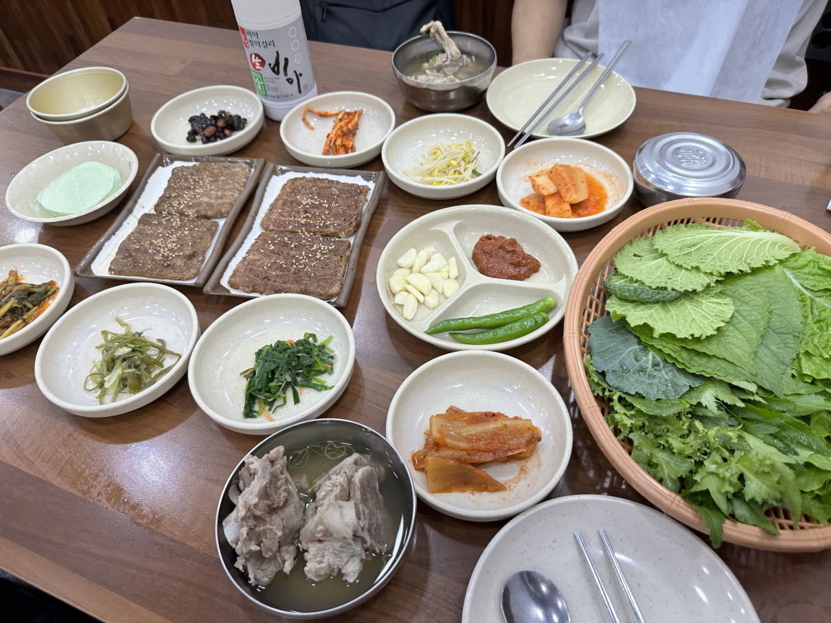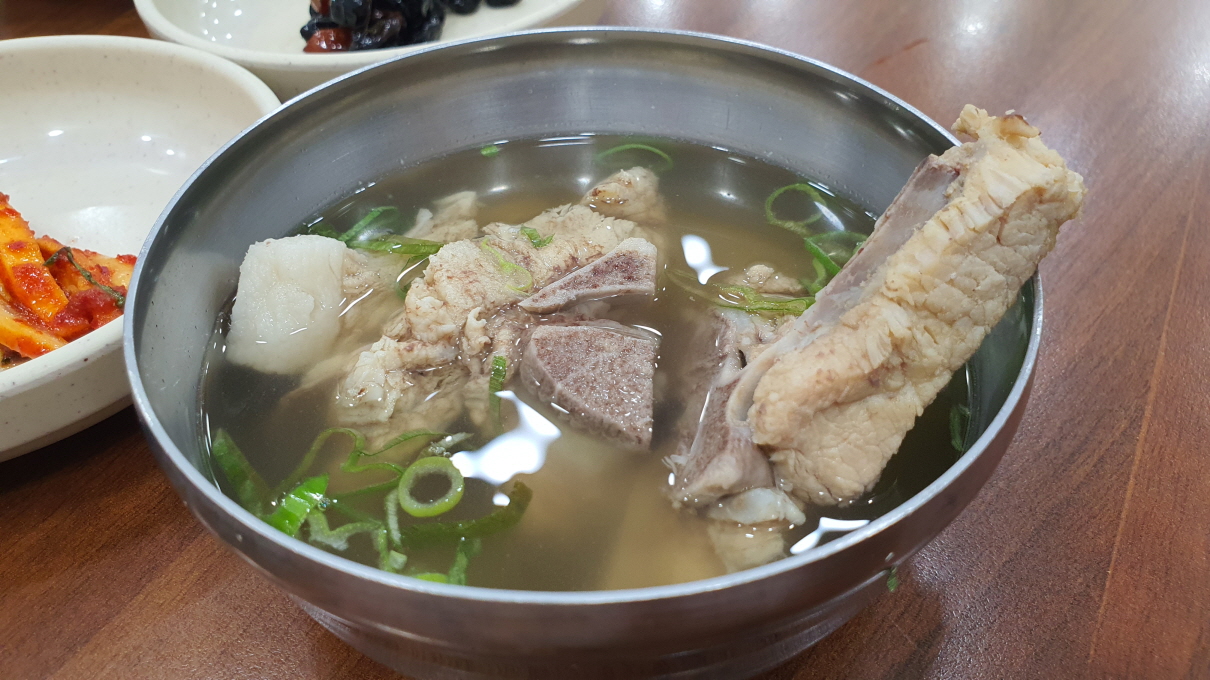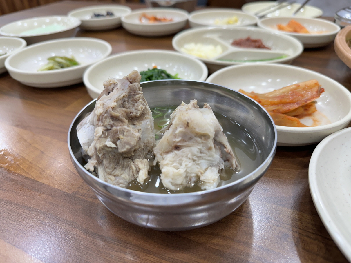떡갈비를 기다리는 동안 한상 차려집니다. 맑은 감자탕 같은 뼈국이 특이하네요.