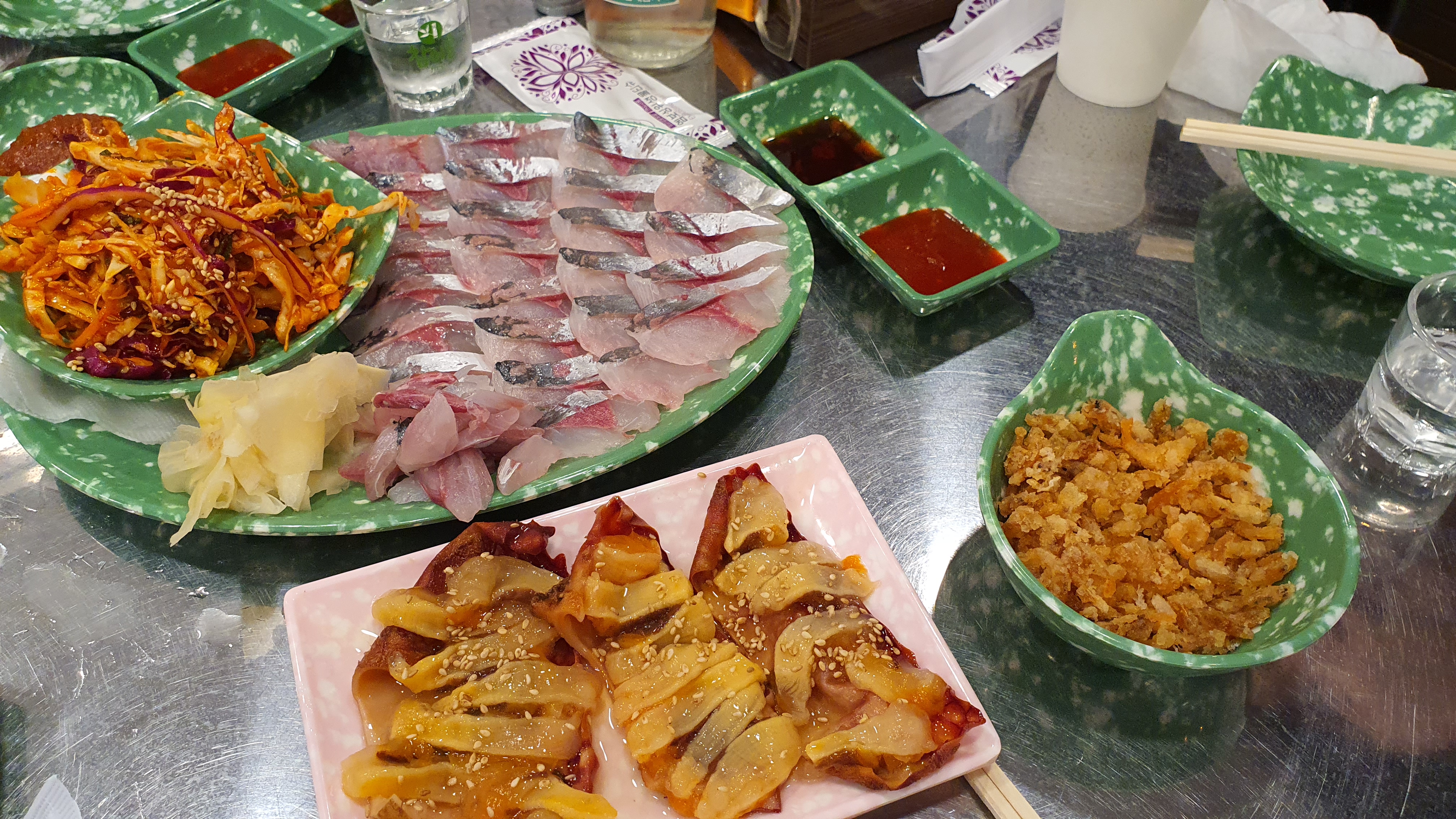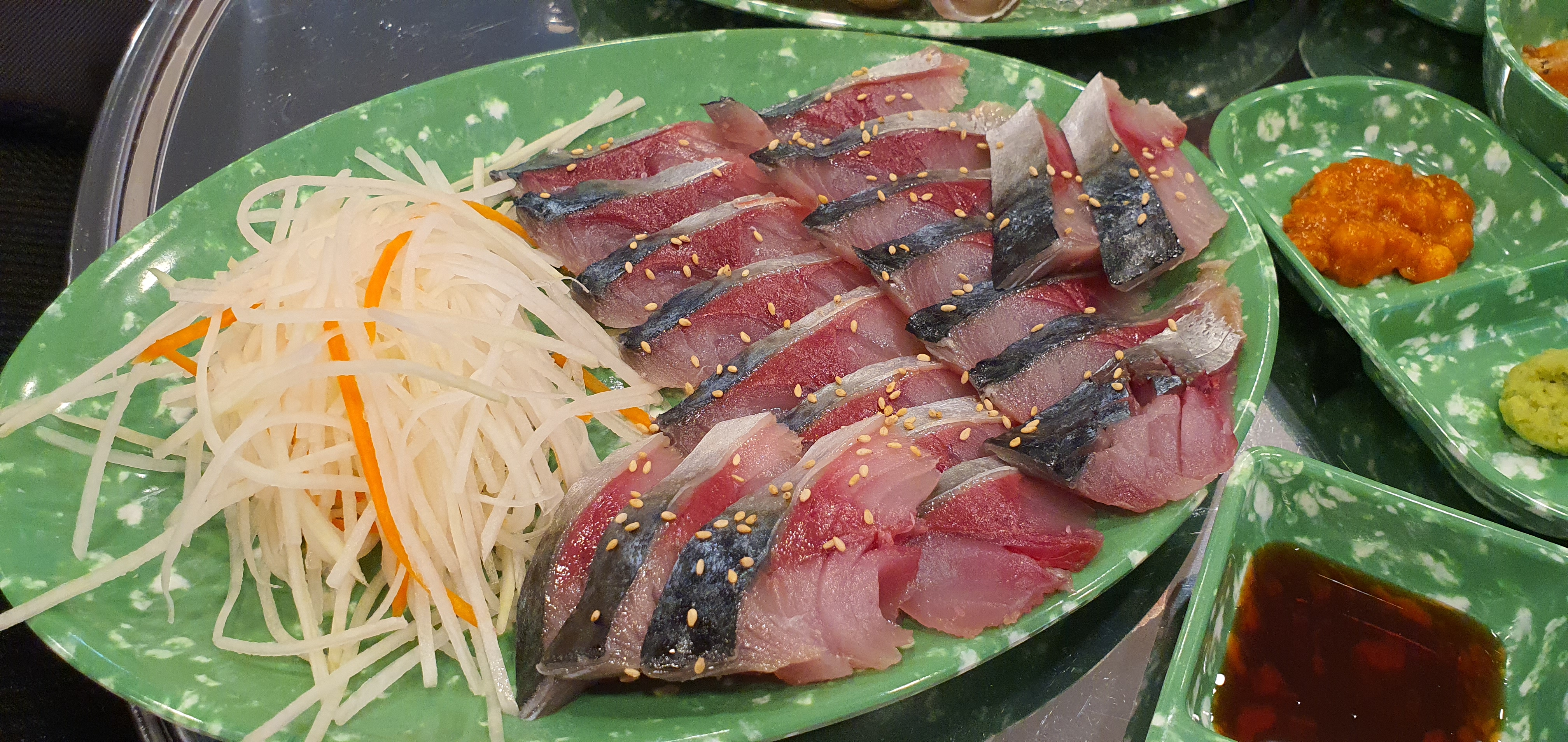 맛있는것이 많지만 제가 소개할 것은 고등어회, 멍게, 전갱이회, 백골뱅이 숙회 입니다.
