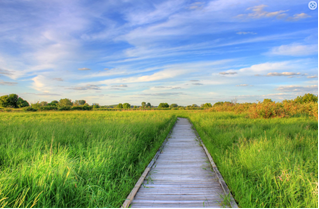 그 가운데로 나무로 만들어진 좁은 데크 길이 뻗어 있습니다. 데크는 매우 직선적으로 놓여 있어서 멀리까지 뻗어 있는 것처럼 보입니다.