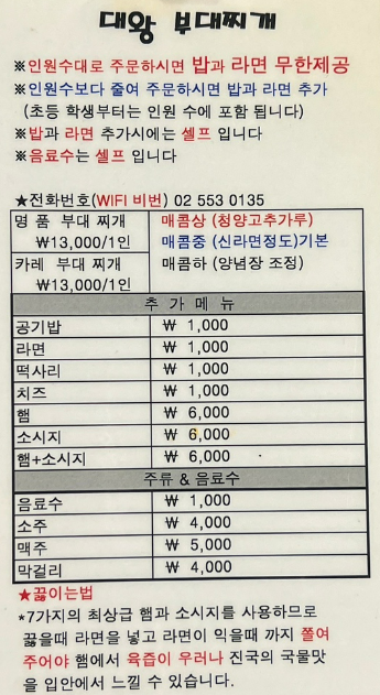 잡다한 거 없이 대왕부대, 카레부대 2종류만 판매하지만 대신 맵기를 선택할 수 있는데 아주 칼칼하게 먹을 수도 있어 상당히 매력적이다.