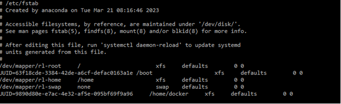 UUID=9890d80e-e7ac-4e32-af5e-095bf69f9a96 /home/docker xfs defaults 0 0
