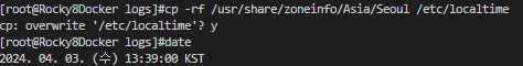 [root@Rocky8Docker logs]#cp -rf /usr/share/zoneinfo/Asia/Seoul /etc/localtime