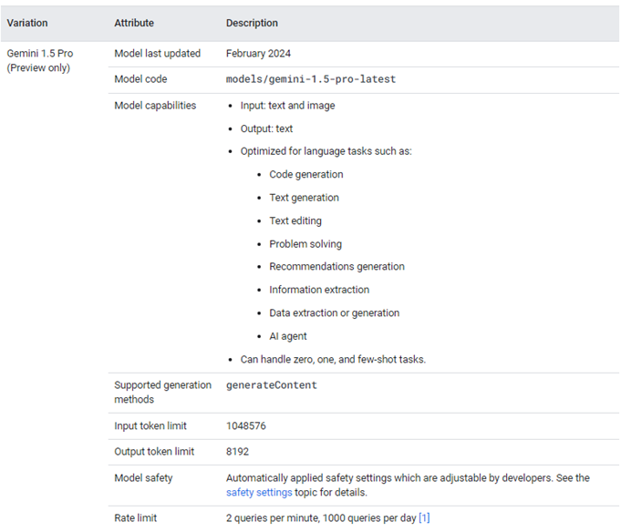 24년 4월 현재 gemini 1.5가 preview 된 상태입니다. 개발자 사이트에서 Google AI Studio를 이용하면 성능을 시험해볼수 있습니다.