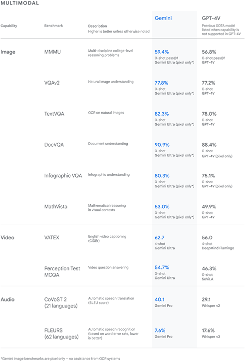Gemini 1.0은 텍스트, 이미지, 오디오 등을 동시에 인식하고 이해하도록 학습되어 따라서 수학이나 물리와 같은 복잡한 과목의 추론을 설명하는 데 특히 능숙합니다.