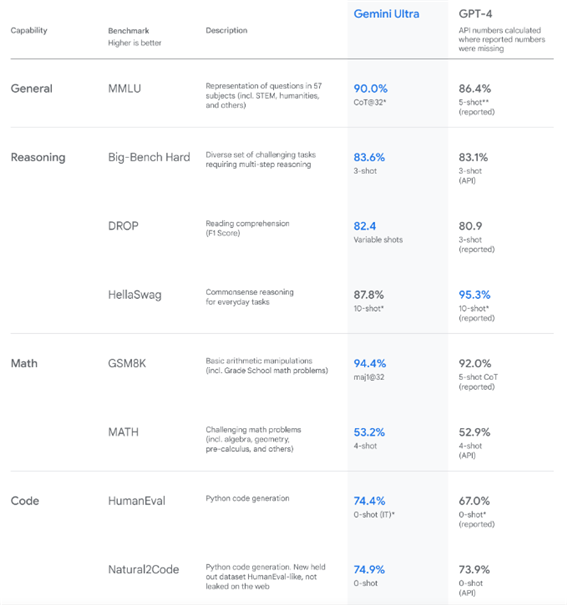 Gemini 1.0 성능 벤치 마크 결과는 다음과 같다고 구글에서 발표했습니다. 수치상으로는 GPT-4를 앞지르는 것으로 보이지만