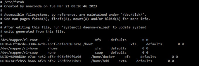 UUID=341fcb55-b646-4f78-bfa2-788f6ba75b81 /home/hdd ext4 defaults 0 0