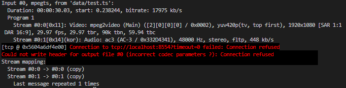 Could not write header for output file #0 (incorrect codec parameters ?): Connection refused