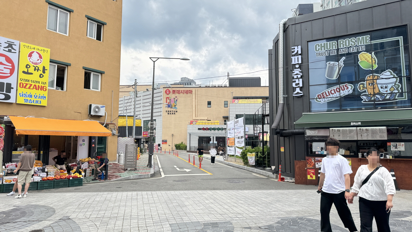주차장에서 나오면 귀여운 건물도 있고 건너에 시장 입구가 보입니다.