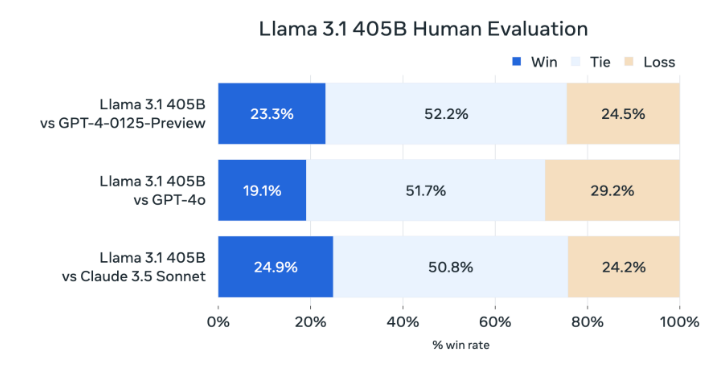 이번 릴리스에서는 다양한 언어에 걸친 150개 이상의 벤치마크 데이터 세트에서 성능을 평가했습니다. 또한 실제 시나리오에서 경쟁 모델과 Llama 3.1을 비교하는 광범위한 인적 평가를 수행했습니다.