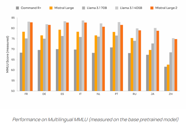 아래는 이전 미스트랄 라지, 라마 3.1 모델 및 코히어의 커맨드 R+와 비교한 다국어 MMLU 벤치마크에서 미스트랄 라지 2의 성능 결과입니다.