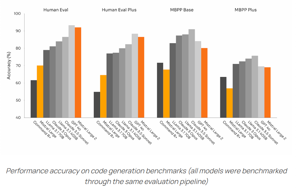 코드 생성 벤치마크 휴먼 이밸(HumanEval) 및 휴먼 이밸 플러스를 보니 라지 2는 'GPT-4o'에 이어 2위네요