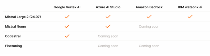 Azure AI Studio, Amazon Bedrock, IBM watsonx.ai에 이어 Vertex AI에서도 Mistral AI의 베스트 모델을 사용할 수 있다고 합니다.