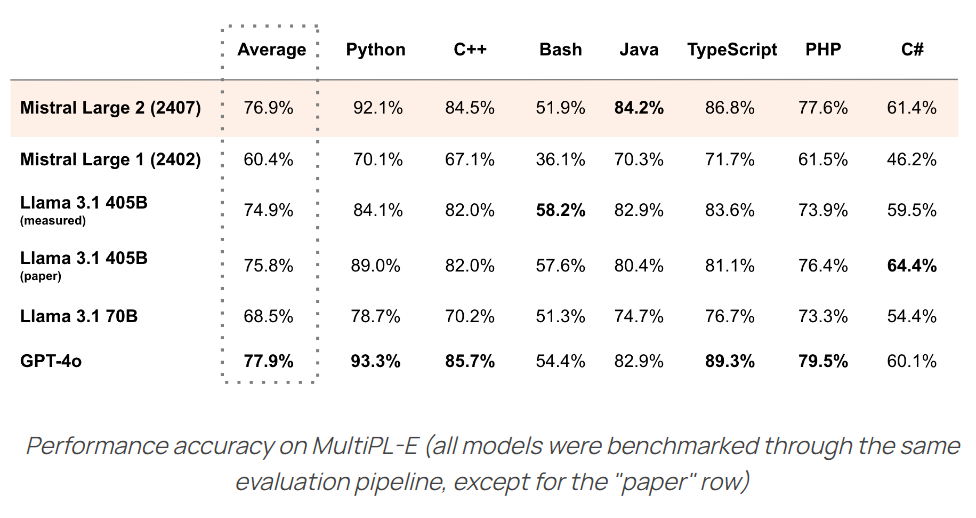 Codestral 22B와 Codestral Mamba 대한 경험을 바탕으로 미스트랄 라지 2를 매우 많은 양의 코드로 학습시켰으며 GPT-4o, 클로드 3 오퍼스, 라마 3 405B와 같은 주요 모델과 동등한 성능을 발휘합니다.