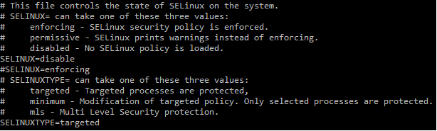 SELINUX 속성값을 disabled 로 변경한 후 저장한다.