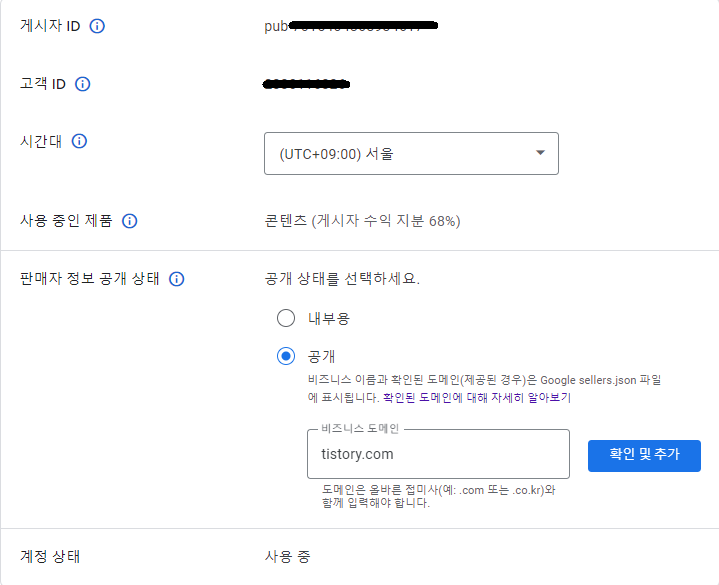 "판매자 정보를 Google sellers.json 파일에 게시하시기 바랍니다. 현재 공개 상태를 검토하려면 계정 설정 페이지를 방문하세요"