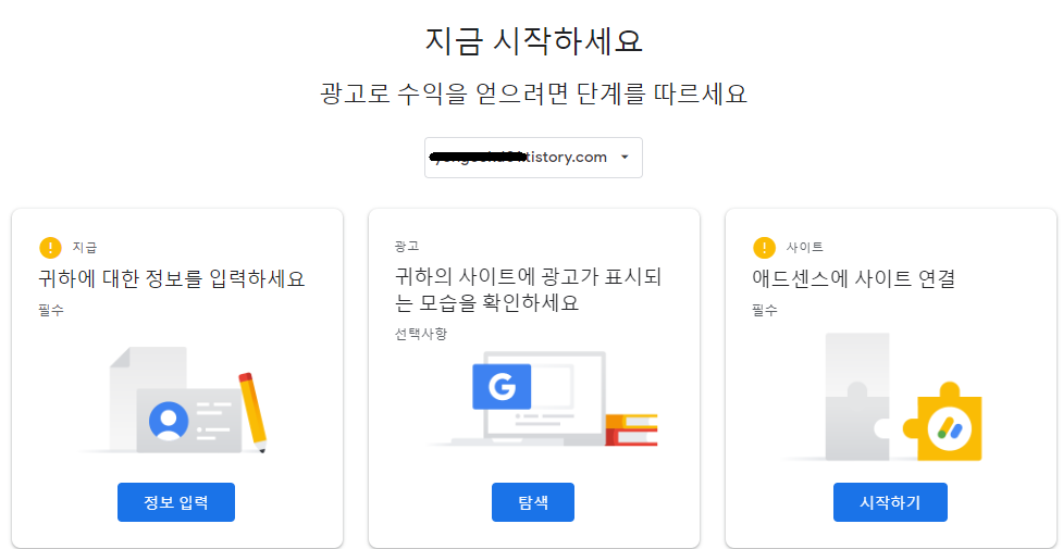 블로그 사이트 주소를 입력하고 애드센스 사용 시작 버튼을 클릭합니다