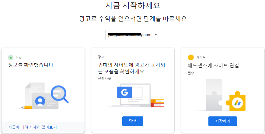 그 다음 "애드센스 사이트 연결" 시작하기를 클릭 합니다.