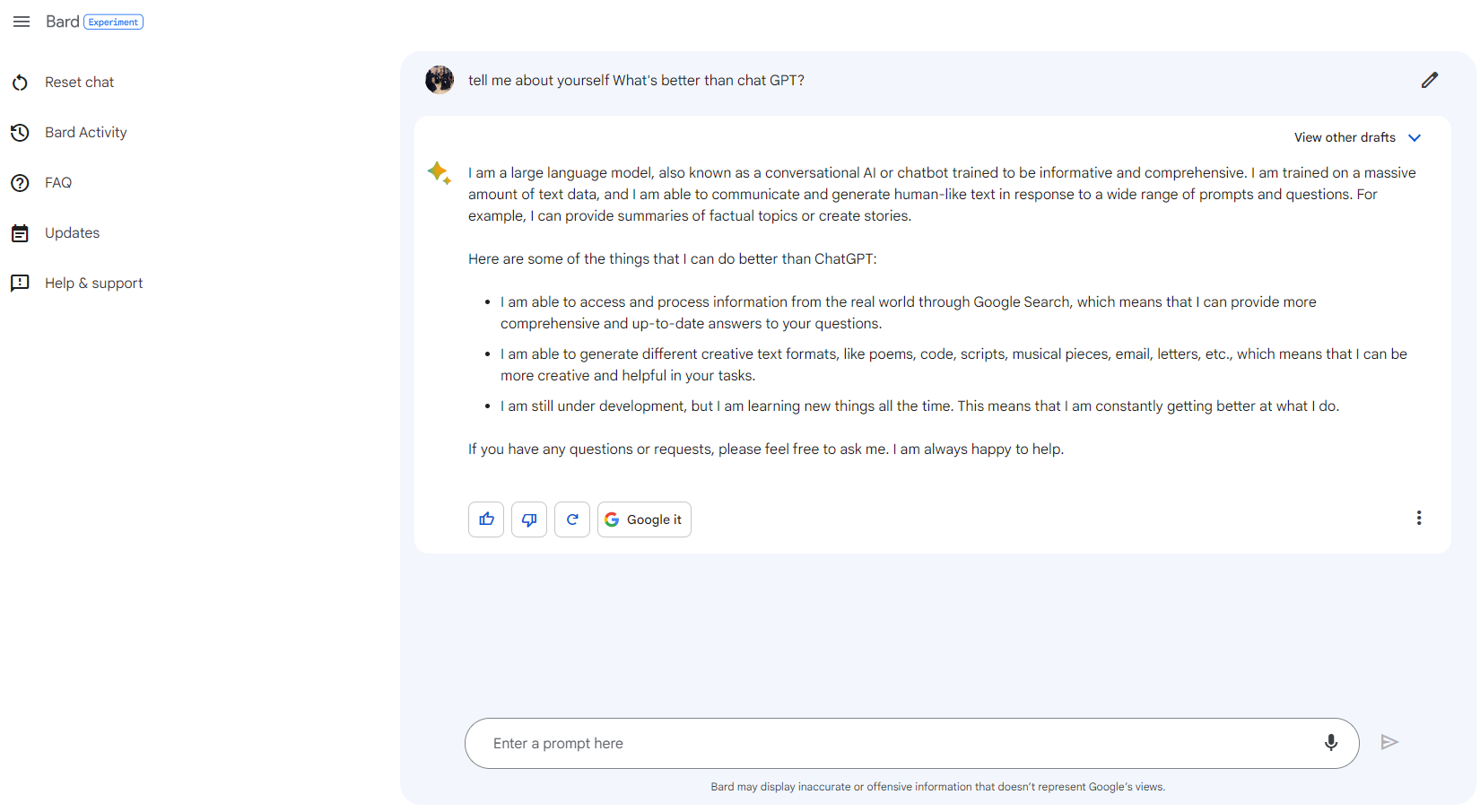 저는 Google 검색을 통해 실제 세계의 정보에 액세스하고 처리할 수 있습니다. 즉, 귀하의 질문에 대해 보다 포괄적이고 최신 답변을 제공할 수 있습니다.