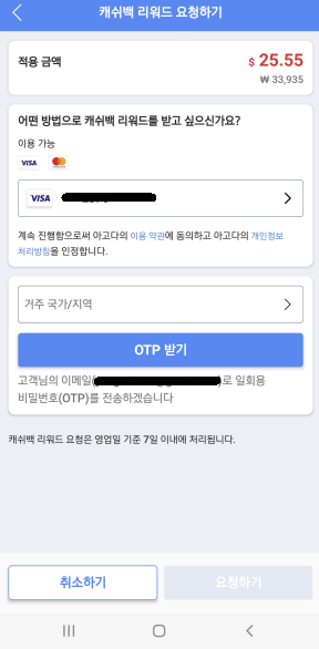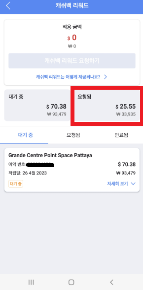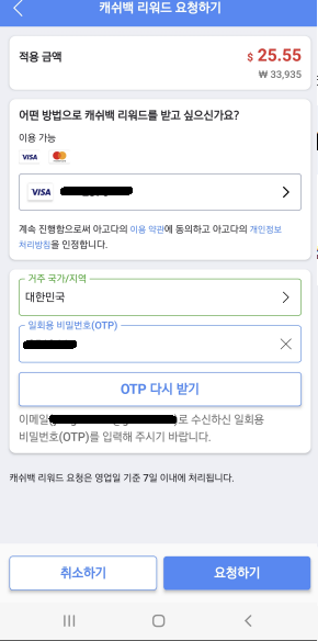 다시 캐쉬백 리워드 메뉴로 가보니 요청됨이라고 표시되어 있습니다.