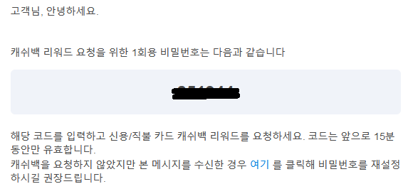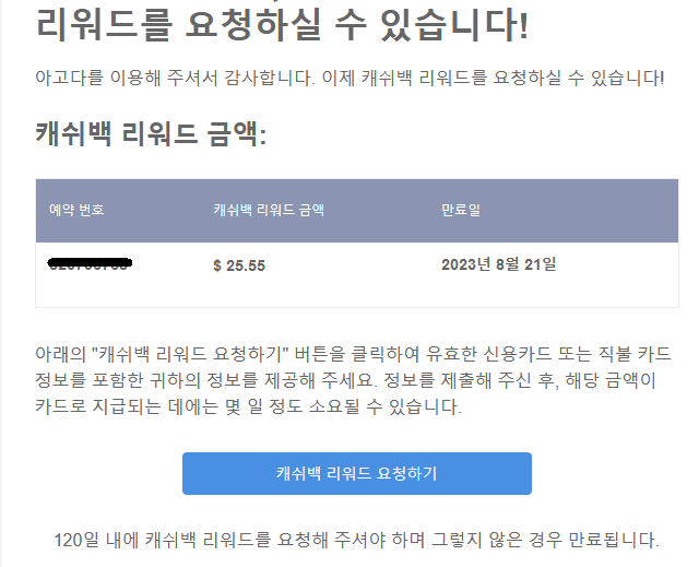 이제 캐쉬백 리워드를 사용할 수 있으니 신청하라는 내용입니다.
