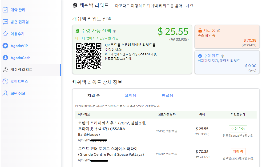 캐쉬백 리워드와 AgodaCash가 따로따로 표시 되어 있는 것을 확인할 수 있습니다.