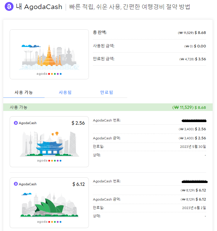 로그인 후 마이페이지 -> 내 AgodaCash에서 사용가능한 캐쉬와 만료된 캐쉬를 볼수 있습니다.