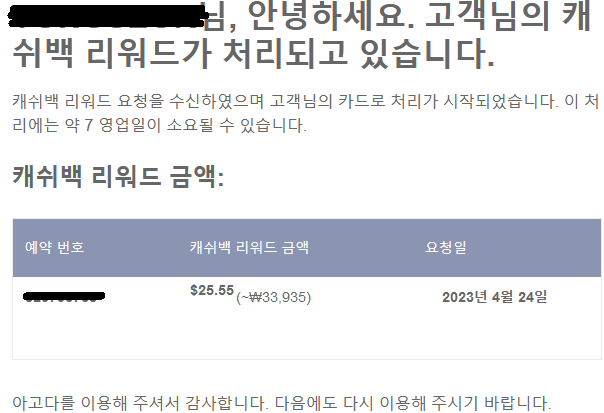 다음날 카드사에서 리워드 금액 만큼 취소된다고 메일이 왔네요.
