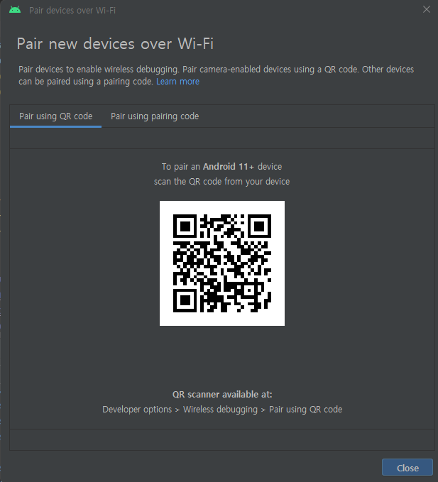 폰의 무선 디버깅에서 QR 코드로 기기 페어링 누르고 안드로이드 스튜이도 화면의 QR 코드를 스캔한다.