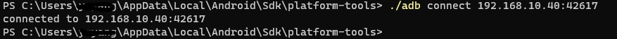 여기서 PowerShell을 열고 폰에 표시된 디버그 접속 포트를 사용하여 adb를 실행한다.