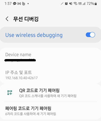 무선 디버깅 메뉴 접속 하여 IP 주소 및 포트 항목 내용을 확인한다.
