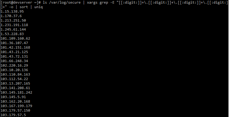 ls /var/log/secure | xargs grep -E "[[:digit:]]+\.[[:digit:]]+\.[[:digit:]]+\.[[:digit:]]+" -o | sort | uniq