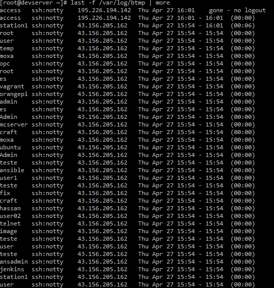 last -f /var/log/btmp | more