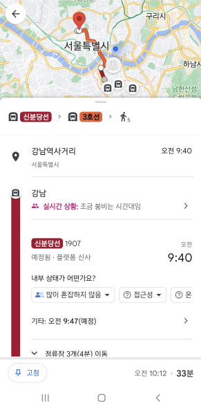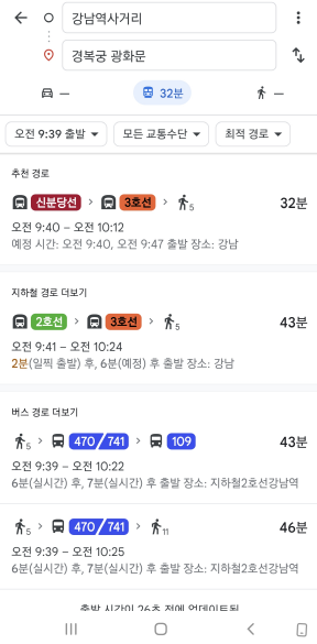 구글 맵을 이용하여 강남역 사거리에서 광화문까지 이동하는 법을 찾아보겠습니다.