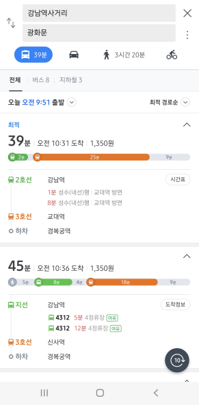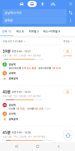 카카오맵을 이용하여 강남역 사거리에서 광화문까지 이동하는 법을 찾아보겠습니다.