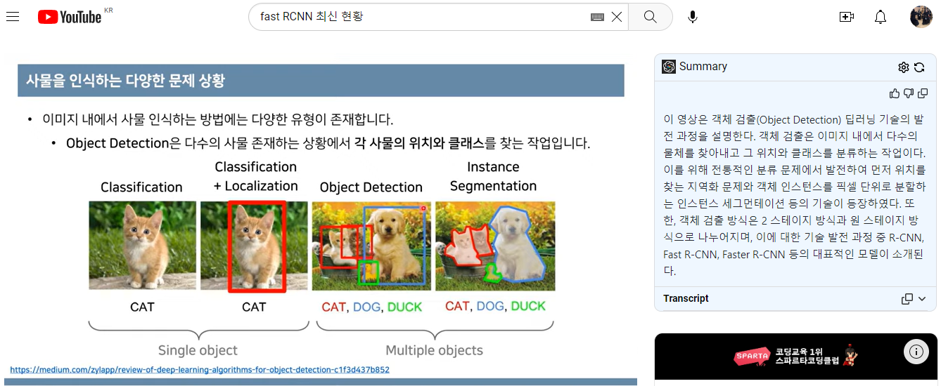 페이지의 우측에 유투브 영상의 내용을 정리해서 표시해줍니다.