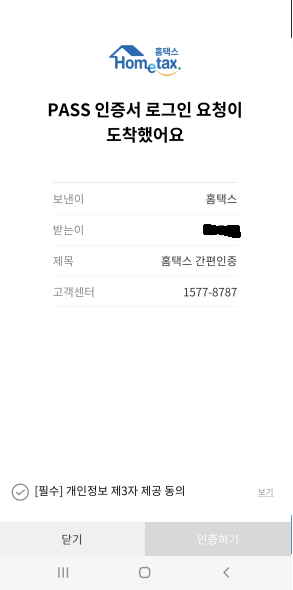 다음을 누르면 핸드폰에 설치된 PASS 어플에 알림이 뜨면서 홈택스에서 인증 요청이 도착하였음을 알수 있습니다.