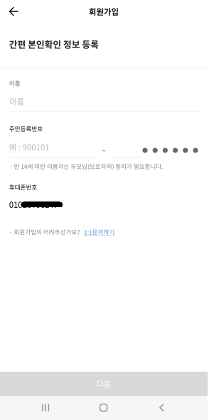 SMS로 인증번호를 수신하여 입력하여 1차 가입을 완료 합니다.