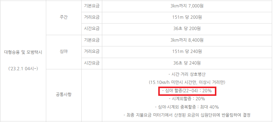 심야 거리요금은 22~23시와 02~04시에는 131m 당 120원이며, 23~02시에는 131m 당 140원