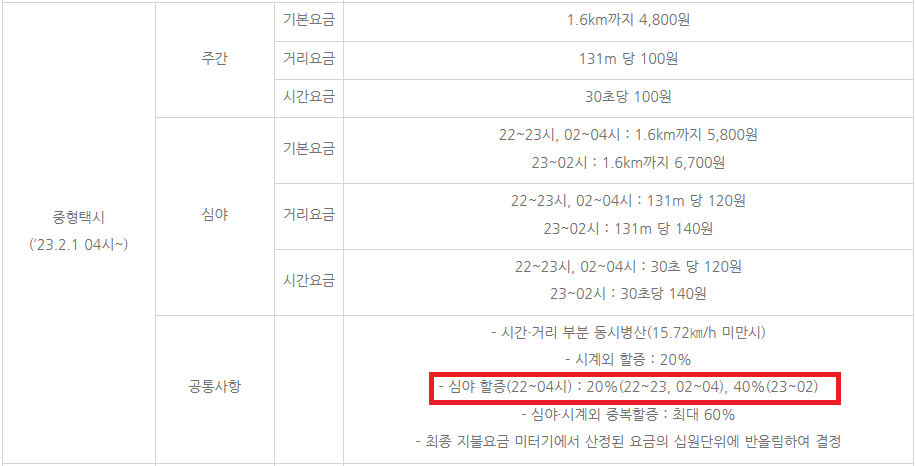 심야 기본요금은 22~23시와 02~04시에는 1.6km까지 5,800원이며, 23~02시에는 1.6km까지 6,700원