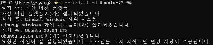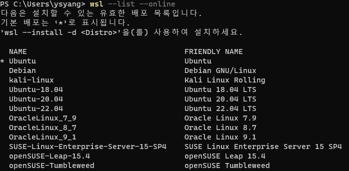 기본 설치 명령어는 다음과 같으며 목록에서 원하는 배포본을 설치 하기 위해서는 뒤에 -d 옵션을 주면 됩니다. wsl --install 만 수행하면 Ubuntu가 설치됩니다.