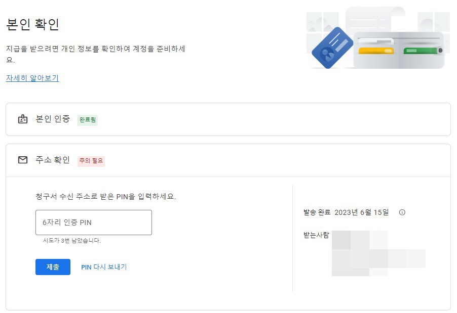 (2) PIN을 받으면 애드센스 계정에 입력하여 주소를 확인합니다.