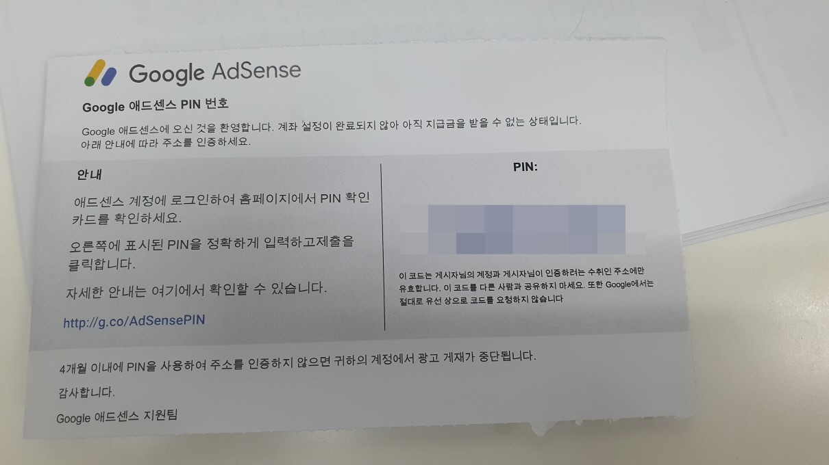 내용을 확인하면 초기에 에드센스 가입시 입력한 주소로 PIN 번호를 보내줄테니 인증하라는 것입니다.