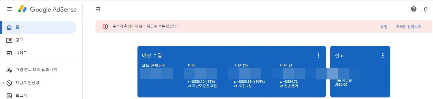 에드센스 사이트에서 "주소가 확인되지 않아 지급이 보류 중입니다." 문구 옆의 "작업" 을 클릭하면 아래와 같은 화면이 나옵니다.