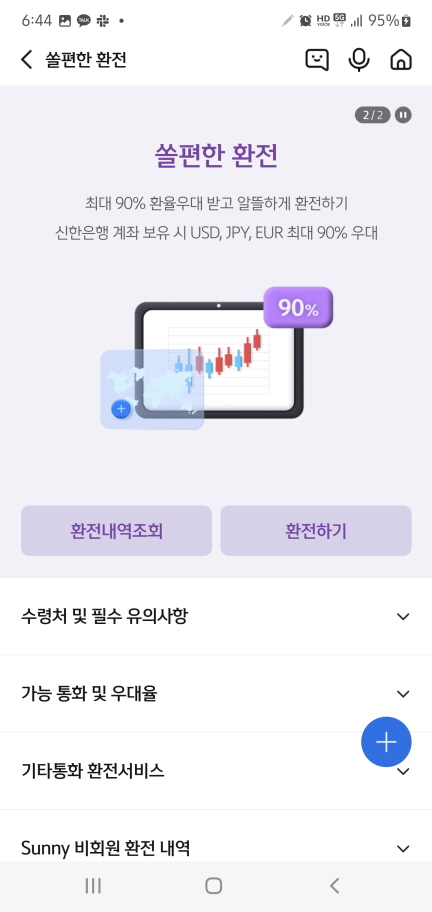 쏠편한 환전을 실행하면 다음과 같이 90% 우대 적용을 받을 수 있다고 나오네요.