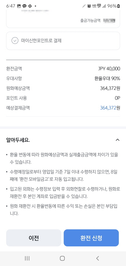 영업점을 지정했으면 환전 신청을 합니다.