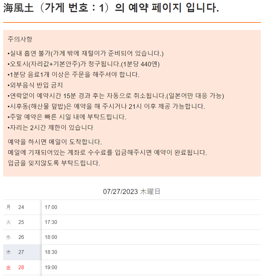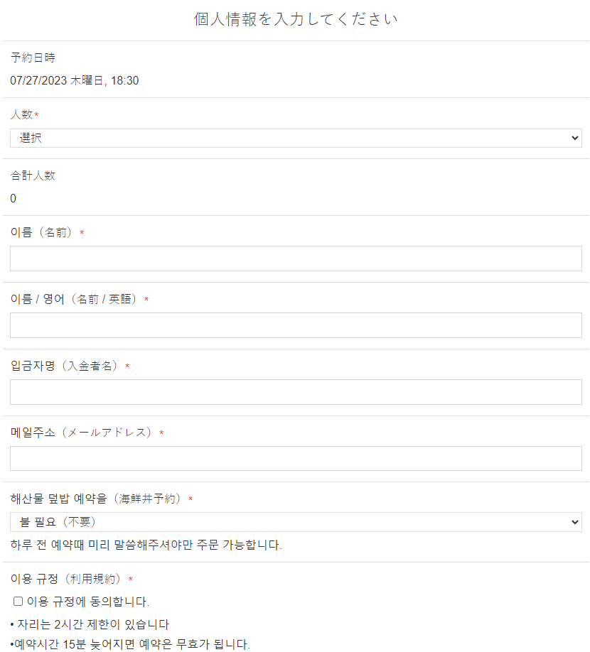 *예약희망일시:07/05/2023 水曜日, 19:00